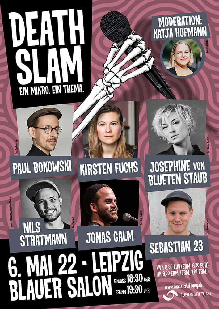 Slam in Halle zu organisieren, wo ich auch wohnhaft bin. Mein erster Gedanke: spannendes Thema, aber traue ich mir das zu? Mit den Thema Tod und Sterben hatte ich so meine Berührungsängste, aber ich wusste auch, dass Poetry Slam so erfrischend ist, dass es helfen könnte, über diese Thematik mehr zu sprechen, und wenn es schafft, meine Ängste abzubauen, dann ja wohl auch die der Zuhörer:innen. Und so habe ich mich an den DeathSlam Halle herangewagt und bin bis heute mit mindestens einem pro Jahr drangeblieben. Die DeathSlams sind ein riesiger Erfolg. Die Locations sind prall gefüllt mit Zuschauer:innen und das Thema wird stets in verschiedensten Weisen in Textform präsentiert. Und heute kann ich sagen: Sie haben meine Angst wahnsinnig geschmälert.