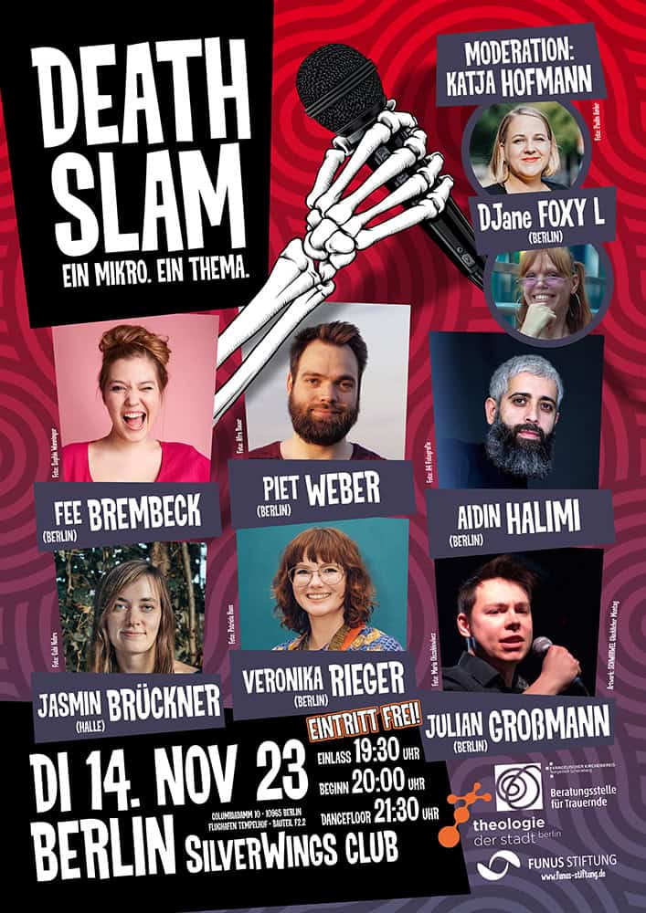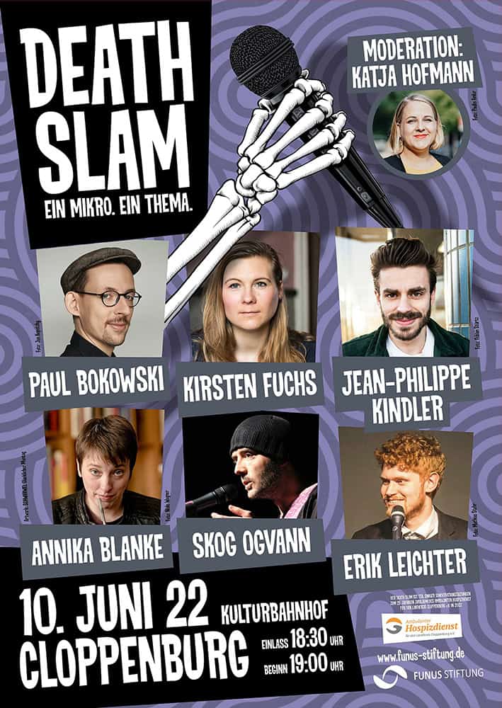 Der DeathSlam ist ein Vortragswettbewerb, bei dem selbstgeschriebene Texte, die den Tod thematisieren, innerhalb einer bestimmten Zeit einem Publikum vorgetragen werden. Die Zuhörer:innen küren durch lebendigstes Applaudieren den Sieger oder die Siegerin des Wettbewerbes. Katja Hofmann organisiert und moderiert den DeathSlam seit vielen Jahren.