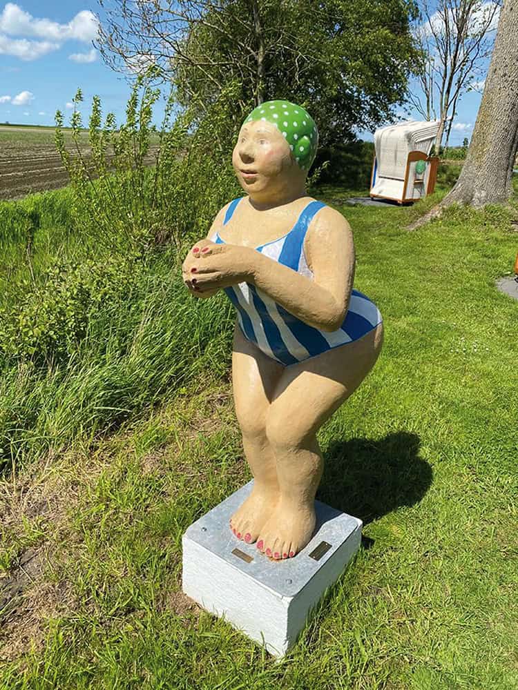 Alles begann mit Constanze. Ich sah sie erstmals im Spätsommer 2020 in einem Garten in Schleswig-Holstein und war gleich verzaubert: diese Anmut, ihr freundliches Lächeln – und nicht zuletzt dieses Selbstbewusstsein, mit dem sie in ihrem gestreiften Badeanzug zum Sprung in die (freilich nicht vorhandenen) Fluten ansetzt. Wie ich durch Nachfragen erfuhr, handelt es sich bei Constanze um einen Alltagsmenschen – eine von den Künstlerinnen Christel und Laura Lechner erschaffene lebensgroße Betonskulptur.