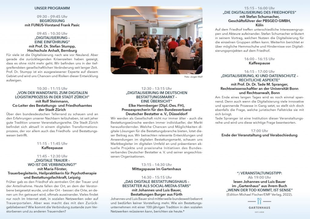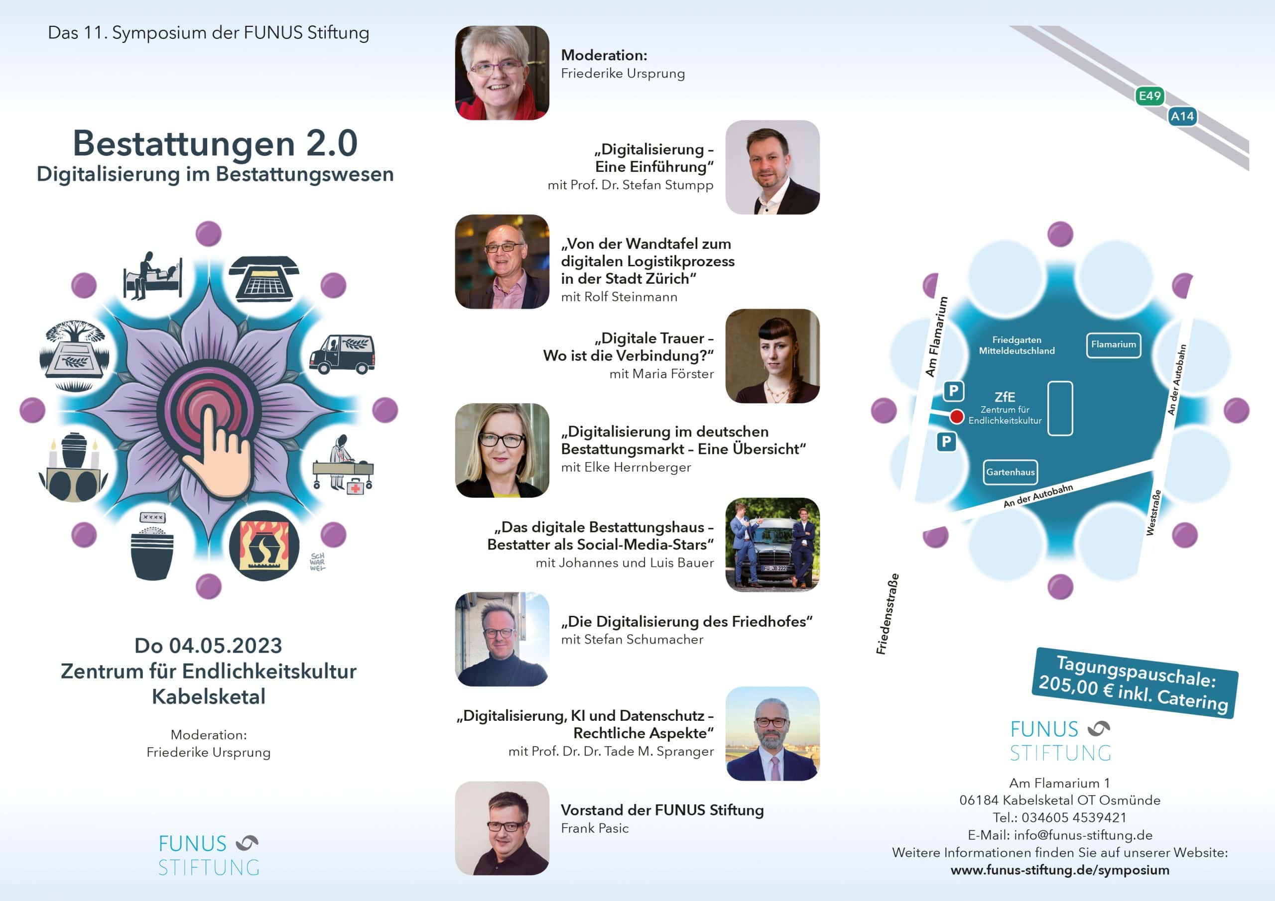 DAS 11. SYMPOSIUM DER FUNUS STIFTUNG: Bestattungen 2.0 4. Mai 2023 0 min read Digitalisierung im Bestattungswesen Die Beteiligten Veranstaltungs- und Programm-Flyer