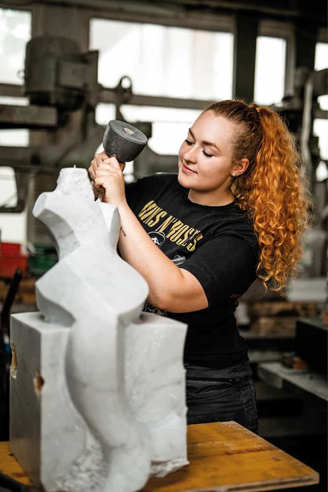 Luisa Lüttig Porträt, Luisa bearbeitet gerade einen Stein, um ein Werk zu erschaffen