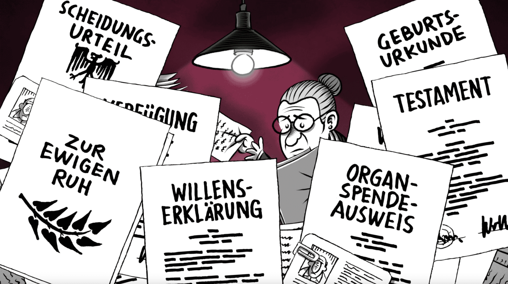 Wenn ein Mensch stirbt, haben die Angehörigen einiges zu beachten. Das ist belastend. Welche Aufgaben das sind, erklärt diese Episode. Sie macht die Anforderungen der Bürokratie verständlich und durch Animation auch plastisch. Vom Arzt-Anruf zur Feststellung des Todes über notwendige Vertragskündigungen bis hin zum Erhalt des Erbscheins werden alle Etappen des Prozesses skizziert und eine persönliche Trauerbegleitung angeraten. Ausführlich erläutert wird, was der Trauernde vom Bestatter erwarten kann.