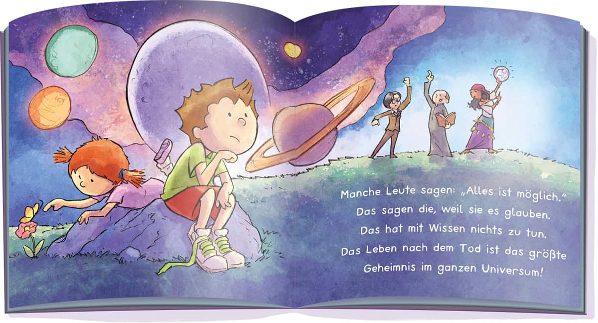 Anja: Ich nenne es „eine Ode an die Phantasie“ und tatsächlich richtet es sich fast mehr an die Erwachsenen als an Kinder. Die Fähigkeit, an etwas zu glauben, das nicht beweisbar ist, wird jedem von uns zur Geburt geschenkt. Die Kunst ist es, dieses Wunder nicht ausziehen zu lassen, nur weil die Vernunft regiert. Kinder ermutige ich nur immer wieder, dass alles ok ist, was sie sich vorstellen. Niemand kann das Gegenteil beweisen, keiner kann mit Sicherheit sagen, was nach dem Tod passiert. Dazu sagt Knietzsche, dass es doch total bescheuert wäre, wenn man sich dann nicht etwas Schönes vorstellt.