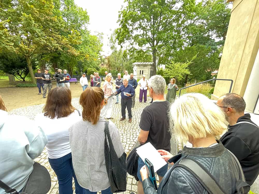 Ausgesucht worden war in diesem Jahr der Friedhof Dreifaltigkeit II im gutbürgerlichen Kreuzberger Bergmannkiez, angelegt vor genau 200 Jahren. „Bringt eure Taschenlampen mit!“, stand als Aufforderung unter der Einladung. Nach einem „Segen to go“, einer musikalischen Begrüßung durch ein Quartett Berliner Philharmoniker und dem Vortrag eines Friedhofshistorikers starteten vier Führungen auf unterschiedlichen Parcours über das Friedhofsterrain und an jedem Grab einer dort beigesetzten Persönlichkeit gab es anschauliche Lebensweginformationen. Doch jäh wurden die Rundtouren plötzlich abgebrochen. Die Polizei war vorgefahren, weil eine Anwohnerin Anzeige erstattet hatte, wegen angeblicher Störung der Totenruhe. Die verblüfften Friedhofsverbandsverwalter:innen konnten sich den Mund fusselig reden, weil es doch genau um das Gegenteil gehe, eine Totenehrung, aber nicht Totenruhestörung. Der Polizeieinsatzleiter beharrte aber auf sofortigem Abbruch der Veranstaltung, die Klageführerin grinsend im Hintergrund. Eine Räumung sei sonst nicht ausgeschlossen.