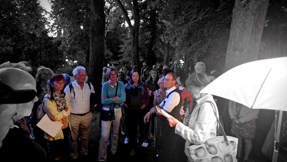 Dazu gehört es auch, an Tote zu erinnern und Lebensgeschichten wachzuhalten, vor Ort auf dem Friedhof, in einem angedachten Friedhofsmuseum und künftig auch virtuell, wenn die Mittel es hergeben. Jährlich gibt es aus diesem Anlass auch einen langen Abend der Friedhofskultur, stets zu Sommeranfang am längsten Tag des Jahres und jeweils auf einem anderen Friedhof in Berlin. An ausgewählten Gräbern werden kurze Vorträge über die Biografien und gesellschaftliche Denkanstöße der dort Beigesetzten gehalten, manchmal werden auch Musikstücke gespielt, wenn dort ein Komponist oder Instrumentenbauer beerdigt liegt, Texte von Literat:innen und Philosoph:innen vorgetragen oder kleine Theaterminiaturen aufgeführt, die auf dort Beigesetzte zurückgehen. Der Zulauf ist beachtlich, das Interesse an den Lebensgeschichten groß. In diesem Jahr kam alles jedoch anders.