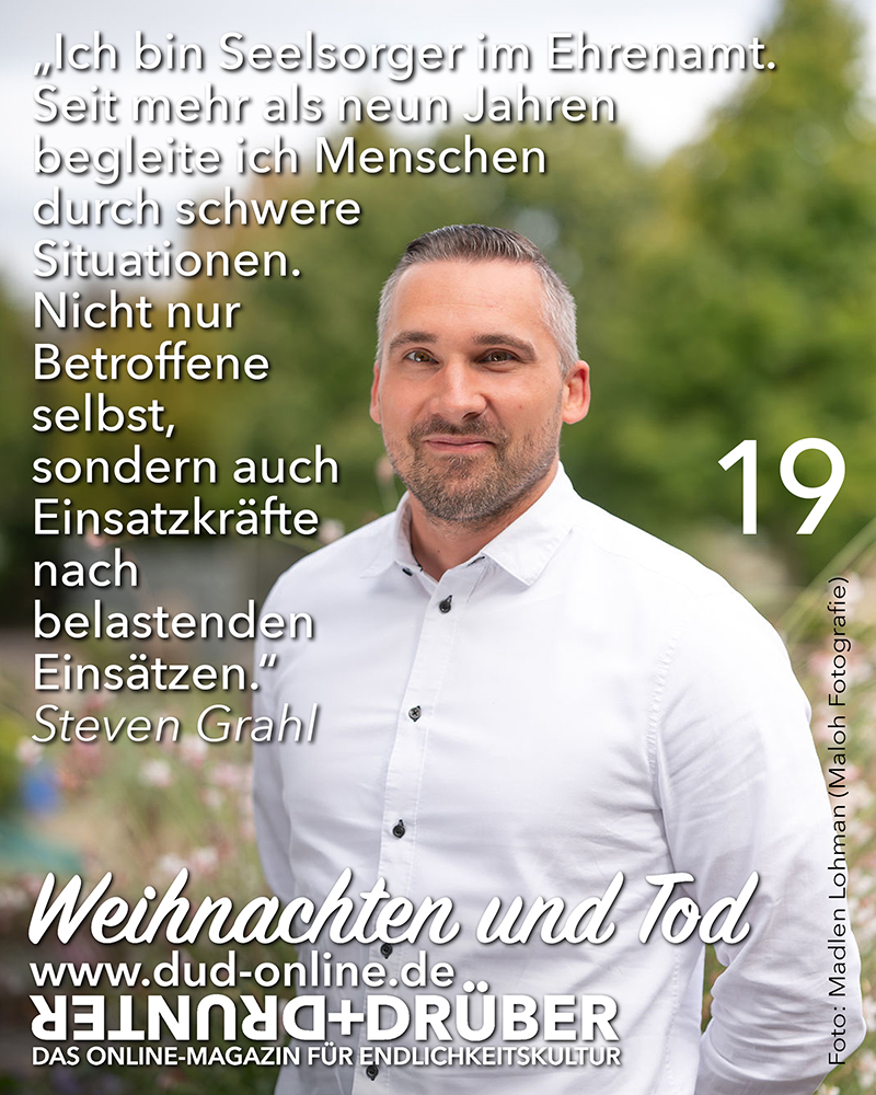 Über den Autor: Steven Grahl war über 13 Jahre im IT-Vertrieb tätig. Gleichzeitig engagiert er sich seit vielen Jahren ehrenamtlich in der Notfallseelsorge und begleitet Einsatzkräfte sowie Menschen in schweren Momenten.